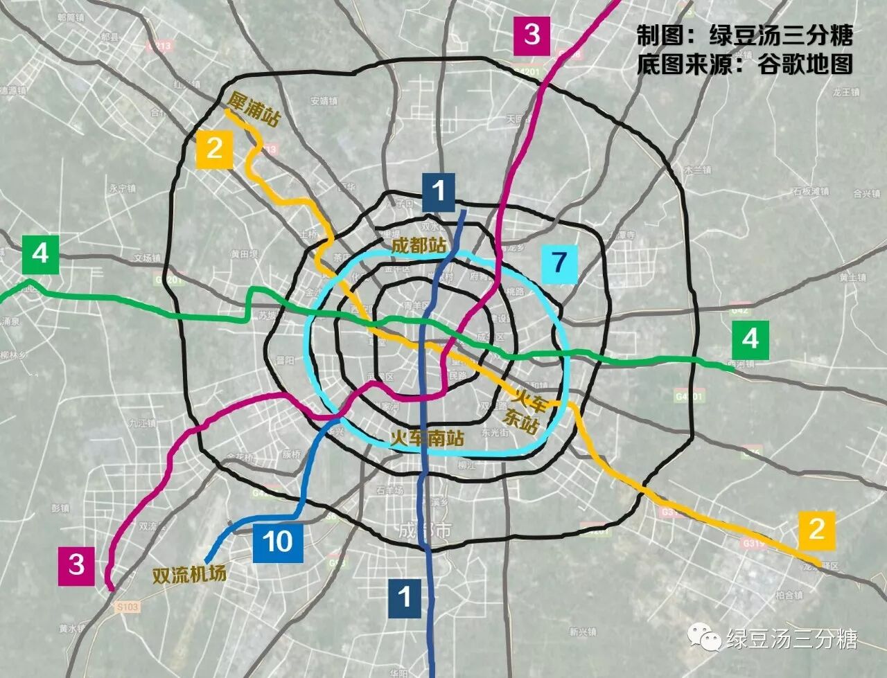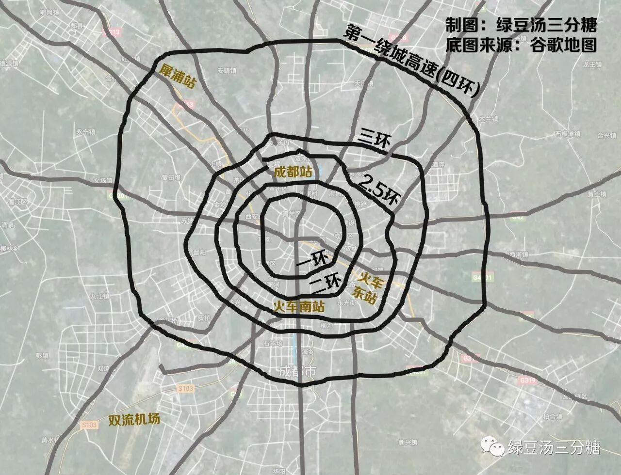 成都市区的街道总体呈蜘蛛网放射状分布,由环和出城通道构成,一环外就可以说是「无问西东」、不分南北,只称呼进城出城方向了。