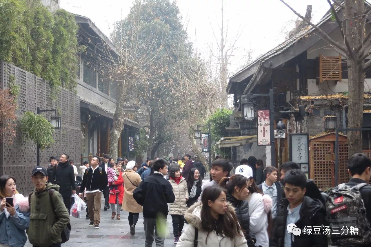 宽窄巷子主要由宽巷子和窄巷子构成,和扬州东关街比较类似。有三大炮(甜点)、掏耳朵(真的掏耳朵,动宾结构,成都特色)、成都老酸奶,还有很多很多熊猫周边店。