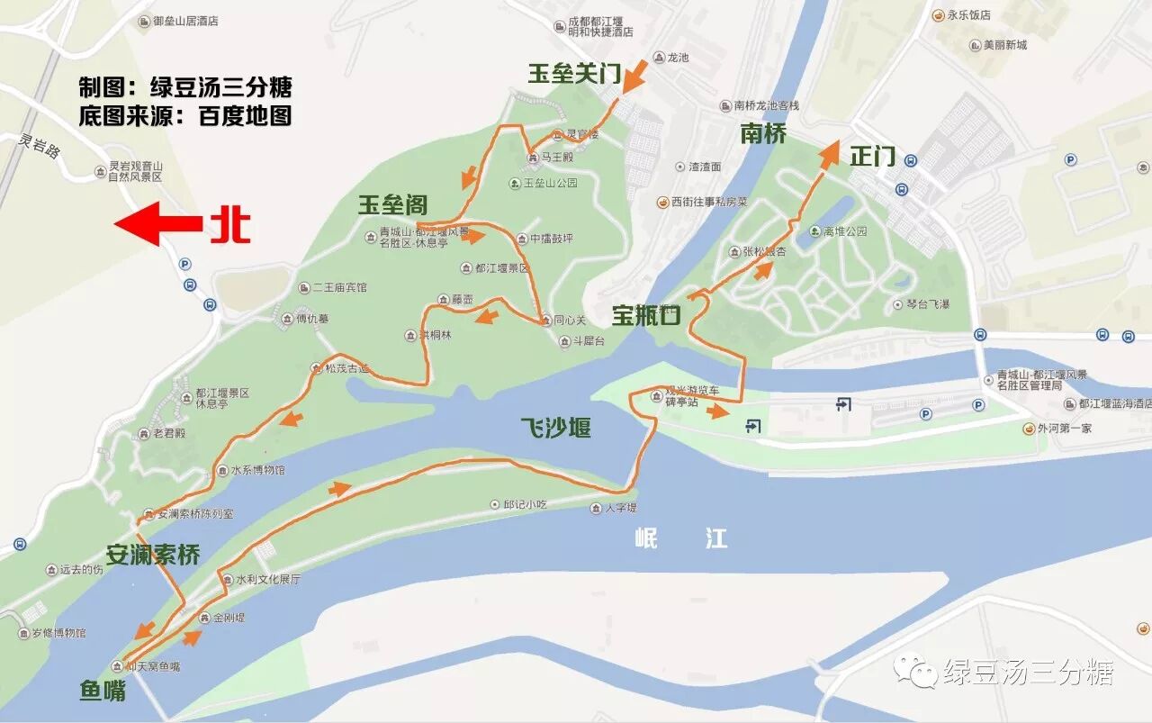 都江堰有好几个门,如果要设计一条可以贯穿所有景观的完美路线,大家就不要从北门进了。最好从”南桥”北侧的玉垒山门进,走右边上山先登玉垒阁,然后步行下山(不建议坐扶梯),过安澜索桥,依次参观鱼嘴、飞沙堰、宝瓶口、伏龙观,最后从南门出。