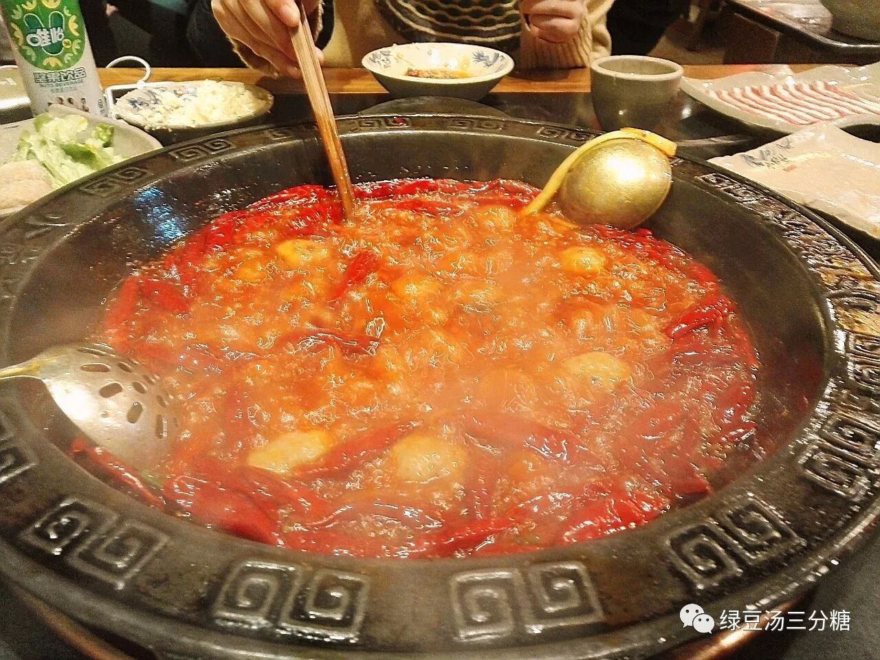 成都的火锅通常是一整锅的红汤,鸳鸯锅只是中间一个小圆形区域是白汤。如果你和小伙伴都没有怕辣的,一定要点全红汤的锅底∠( ᐛ」∠)_