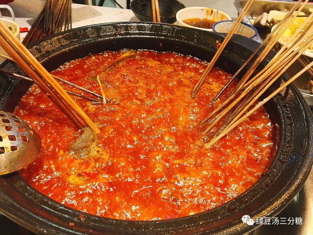 串串的锅底和火锅一样,只是菜由火锅的一盘一盘变成一串一串,这样可以更加灵活地调整每样菜的量。串串都是自己去冰柜按需取的,吃完老板会数你一共吃了多少根(这个过程叫「数签签」),然后结账。