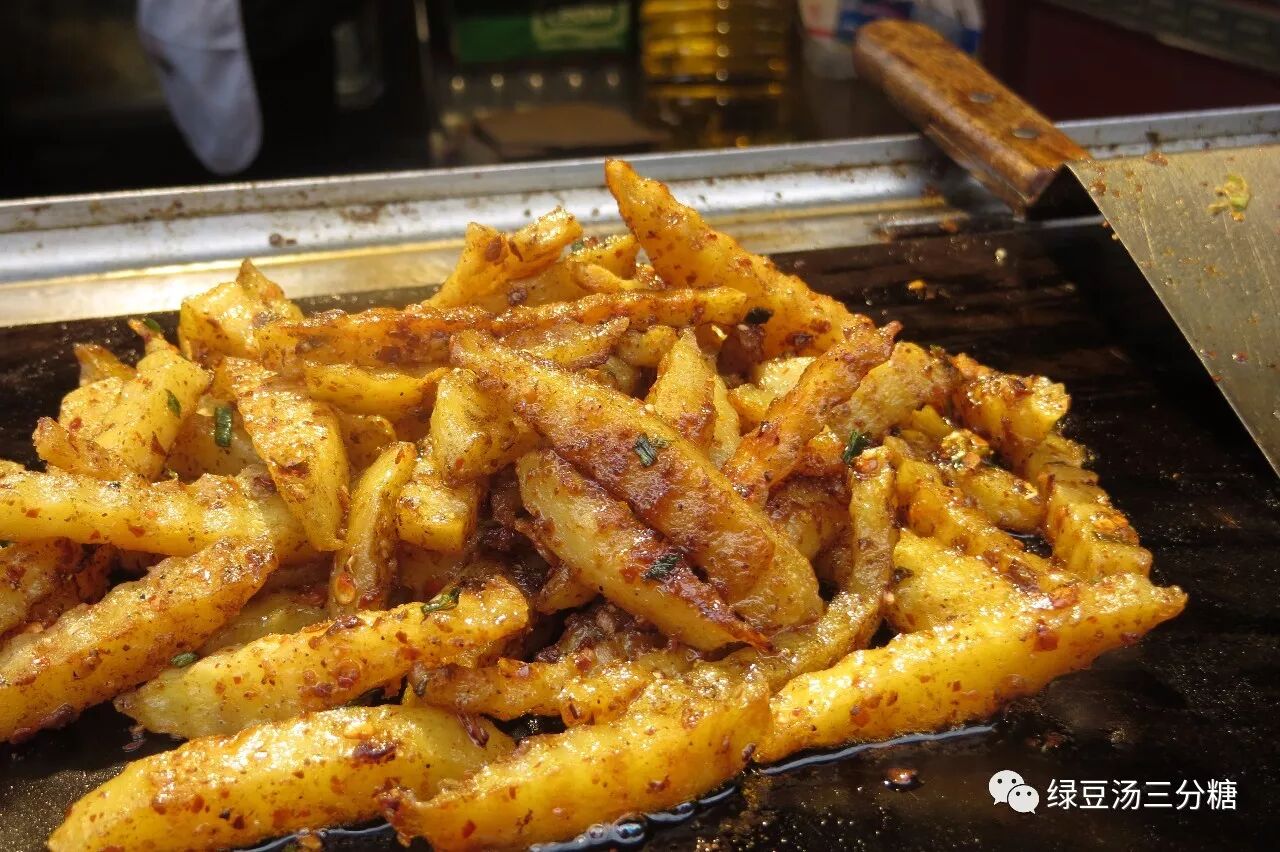 炸土豆条也是一种常见的路边小吃,把土豆切成波浪形的花条后,放在铁板上炸,再撒上香料和辣椒粉,嚼起来半软半酥。